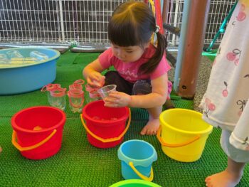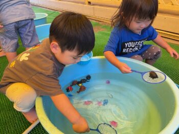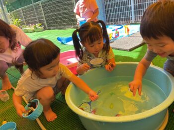 7月、8月の水遊びでは、色水遊び、色氷を使った感触遊び、金魚すくいや