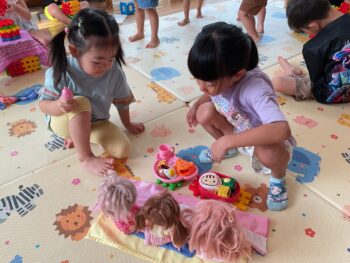 貸してあげて、貸してもらった子の「ありがとう」の言葉と共に仲良く遊ぶ姿が