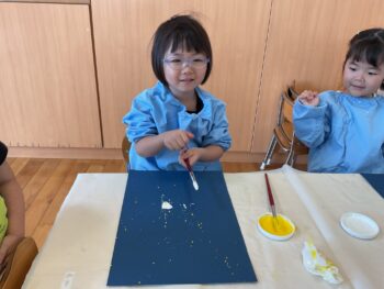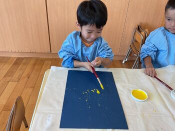 大胆にする子どもや慎重にする子どもと様々な様子が見られ、絵の具が綺麗について