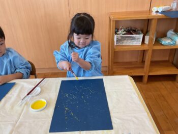 白色と黄色の絵の具を付けた筆をもち、筆を”とんとん”と叩きながら、絵の具を飛ばし、