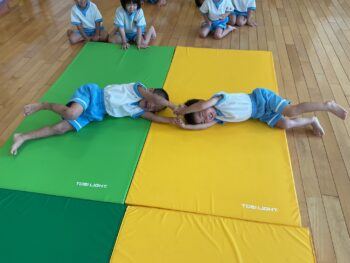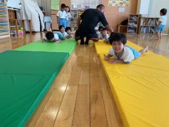 マットの上をうまやワニのように進んだり、お友達と手を繋いだり合体をしたりして