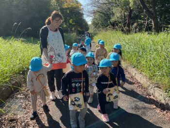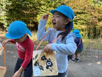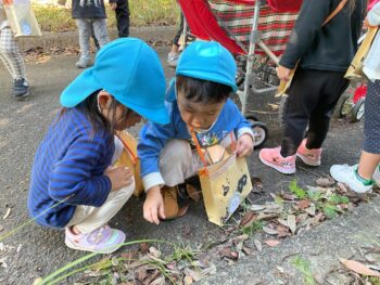 見つけたどんぐりをお散歩バックの中に入れてルンルンな子どもたちは