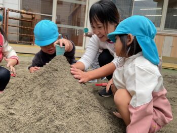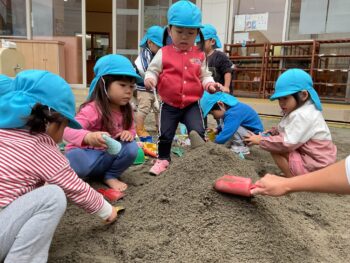 お外遊びでは、砂遊びが大好きで大きなお山を作ったり、アイスクリームや車など好きな形を