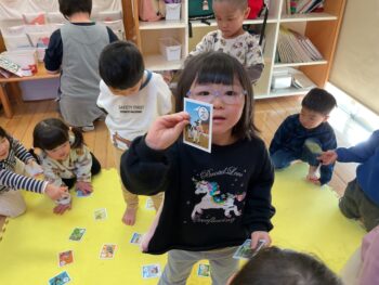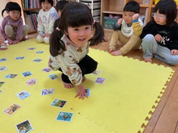 まだひらがなを読むことは難しいですが、かるたの読み札を聞いて、絵で探したり