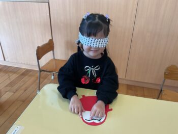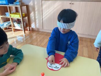 目隠しをして、だるまに顔のパーツを貼りました。「おめめどこ?」「あってる?」など