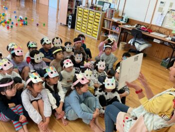 始めは、豆まきの由来の紙芝居の読み聞かせ。鬼が嫌いな物は、いわしの頭とひいらぎの葉っぱ。