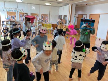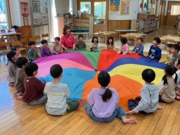 室内でも、さくらさくらんぼリズム遊びで、全身を使って体を動かしたり、パラバルーンを