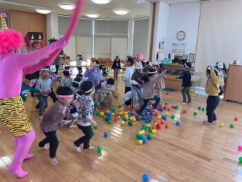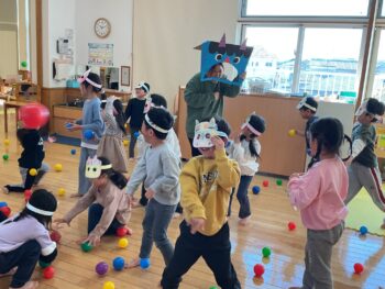 不意打ちで第2段目の鬼が現れましたが、部屋に広げられたやわらかボールを手に、みんなで